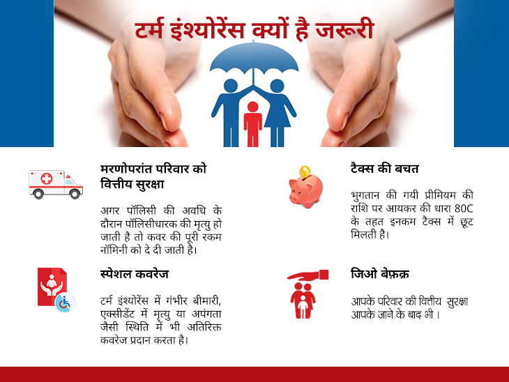 यह एक साधारण लाइफ इंश्योरेंस प्लान है यह आपके नहीं रहने पर आपके परिवार की वित्तीय जरूरतों को पूरा करता है अगर किसी व्यक्ति ने टर्म प्लान लिया है, तो उसकी दुर्भाग्यपूर्ण मौत होने की स्थिति में परिवार को अच्छा खासी राशि मिल जाती है. कोई भी व्यक्ति 18 साल से 65 साल की आयु के बीच कभी भी टर्म इंश्योरेंस (Term Insurance) खरीद सकता है कई मामलों में 75 साल तक के लिए कवरेज देने वाले टर्म प्लान भी उपलब्ध हैं. टर्म प्लान सुनिश्चित करता है कि आपके न रहने पर आपके परिवार को रोटी, कपड़ा, मकान की जरूरतों की पूरी करता है